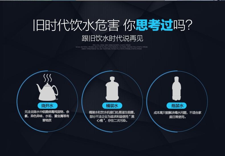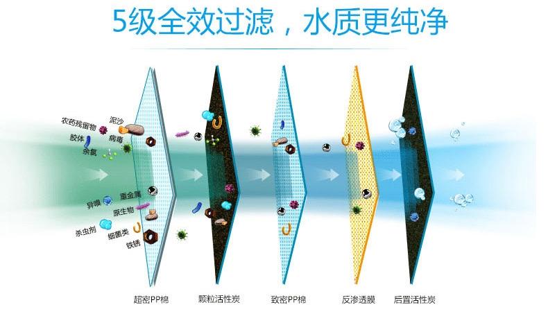 第四級:RO逆滲透膜:去除水中細菌、重金屬、鹽分、不良礦物質及其他溶解物和在自來水處理過程中所加入的化學藥劑。(世界六大高科技產品之一-逆滲透膜:孔徑只有細菌五千萬分之一,能徹底濾除所以細菌、病毒、農藥、有機物、重金屬等化學污染物。能將海水變淡水,太空人尿液過濾后再飲用,桶裝水就是采用逆滲透原理生產的。)
